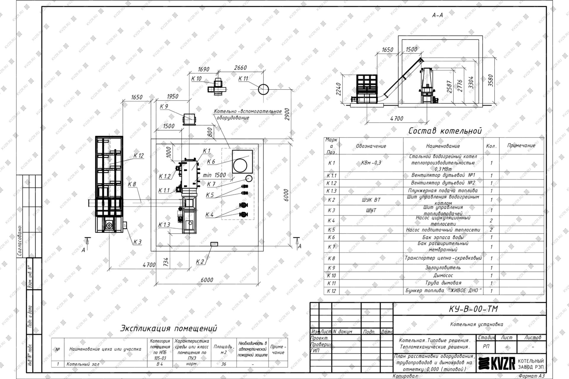 Водогрейный твердотопливный стальной отопительный котел 0.35 МВт на опилках, предназначен для получения горячей воды номинальной температурой на выходе из котла от 95 до 115 °С рабочим давлением до 0,6 (6,0) МПа (кгс/см), используемой в системах централизованного теплоснабжения на нужды отопления, горячего водоснабжения. Устанавливается в производственных, промышленных и отопительных котельных.
