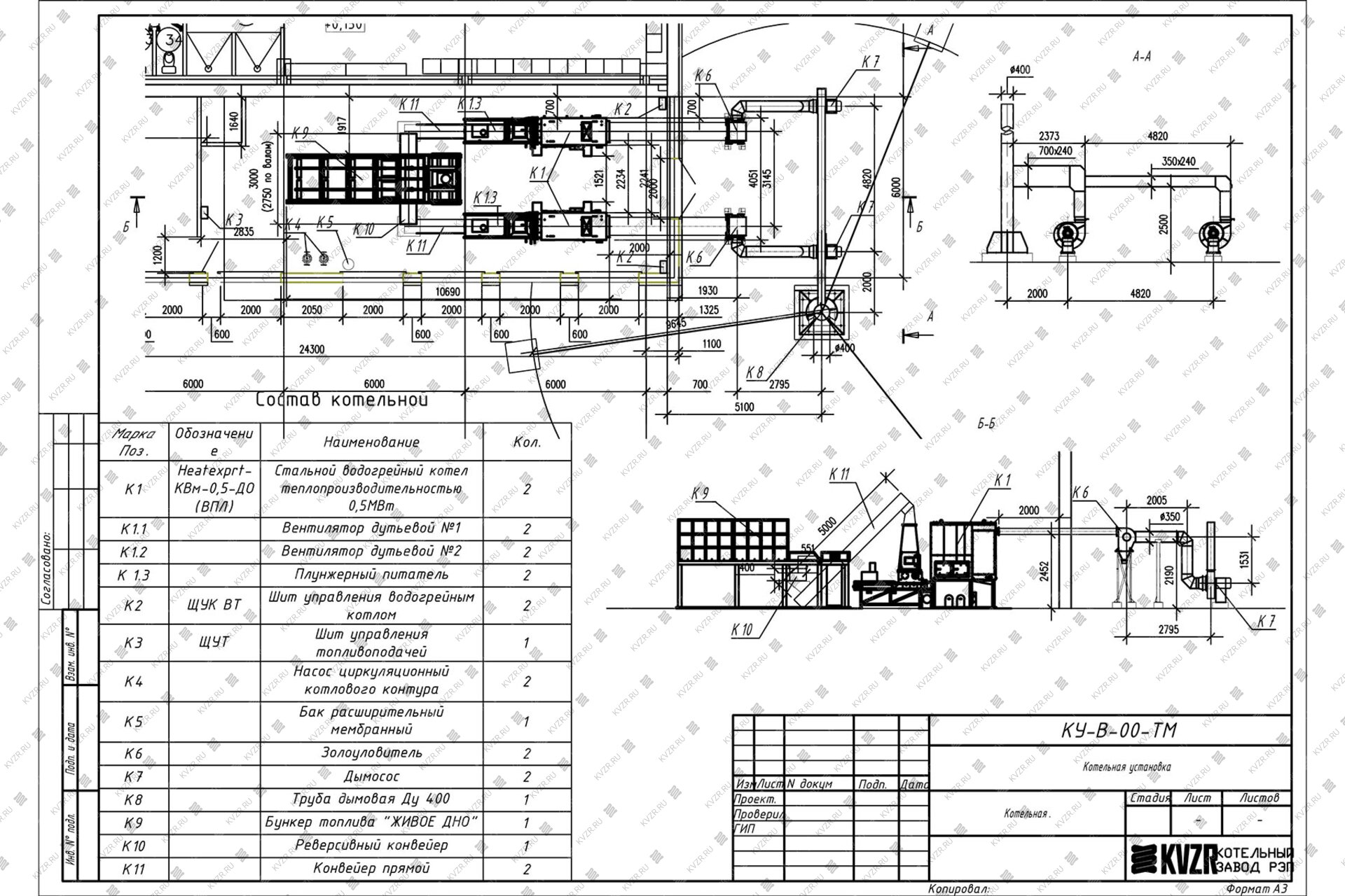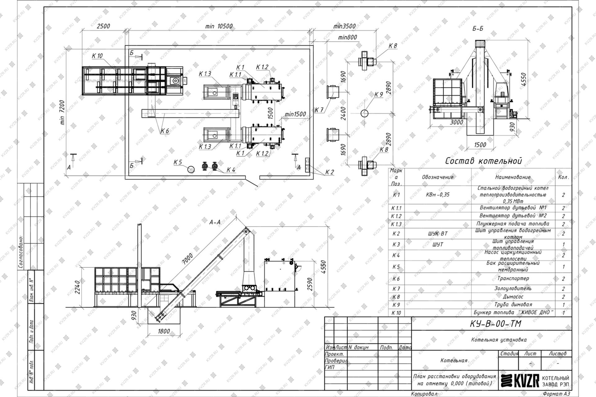 Чтобы правильно подключить котел 0.35 МВт на опилках в котельной необходимо оставить проемы для обслуживания оборудования во время эксплуатации. На представленной здесь схеме указаны их минимальные размеры. Кроме того, в данной примерной схеме монтажа водогрейных котлов и оборудования указан перечень минимально необходимого вспомогательного оборудования для правильной работы котла.
